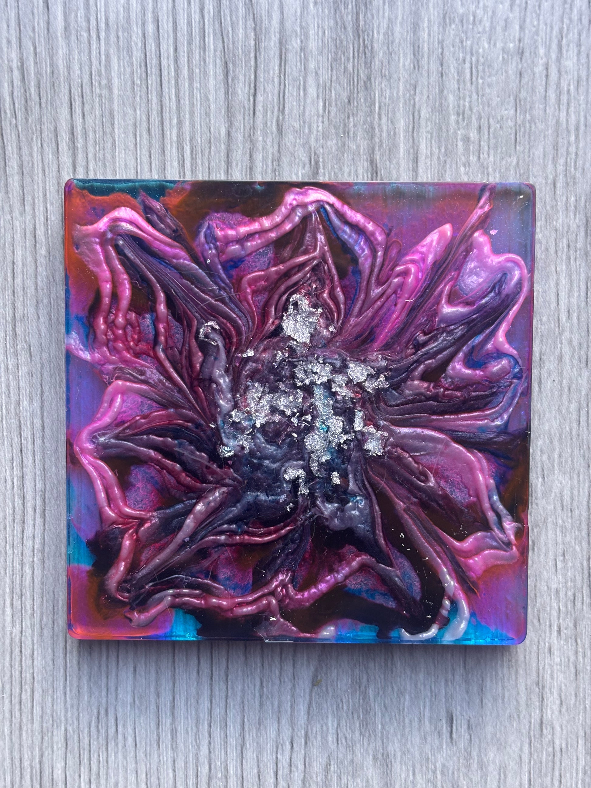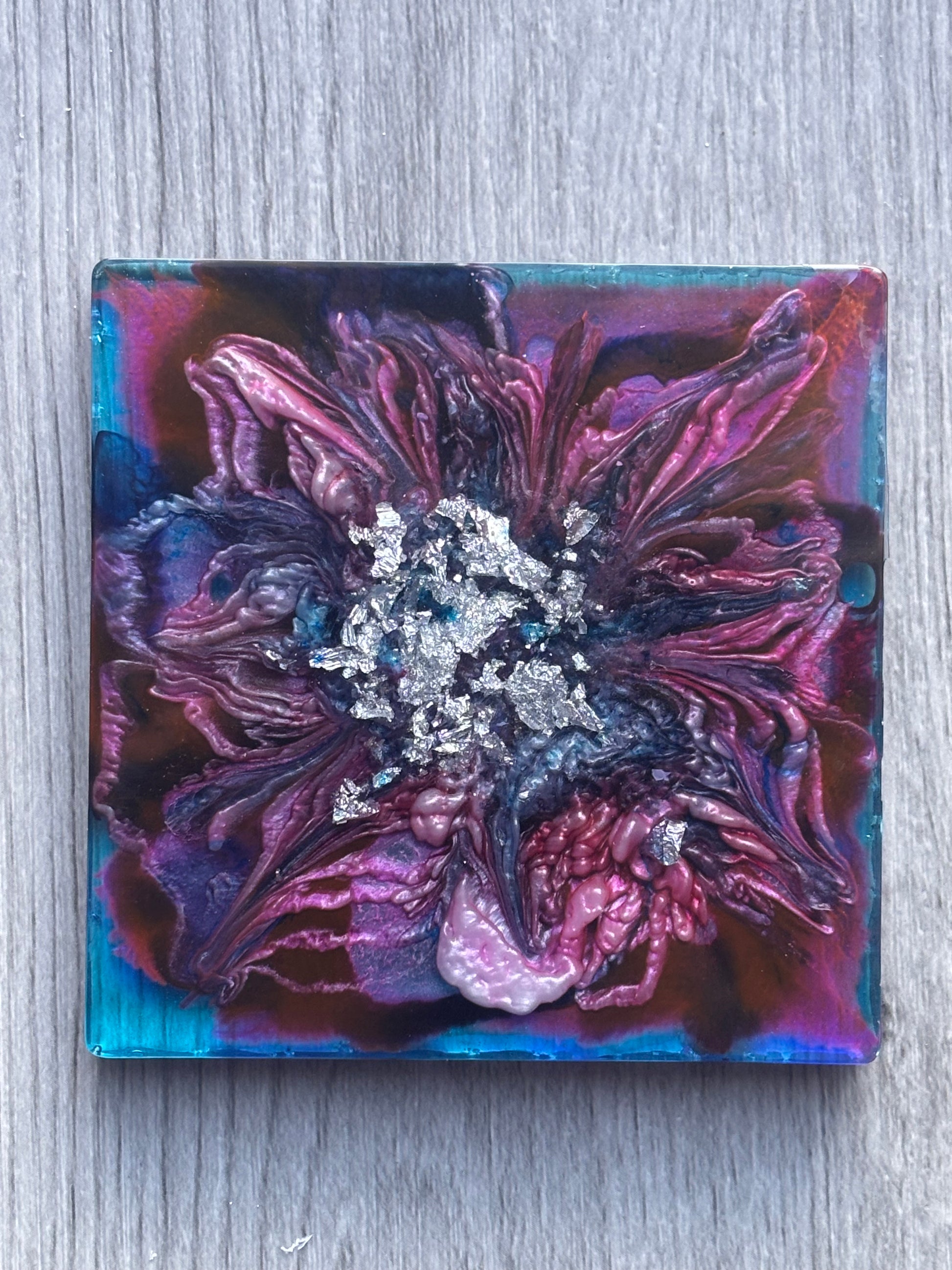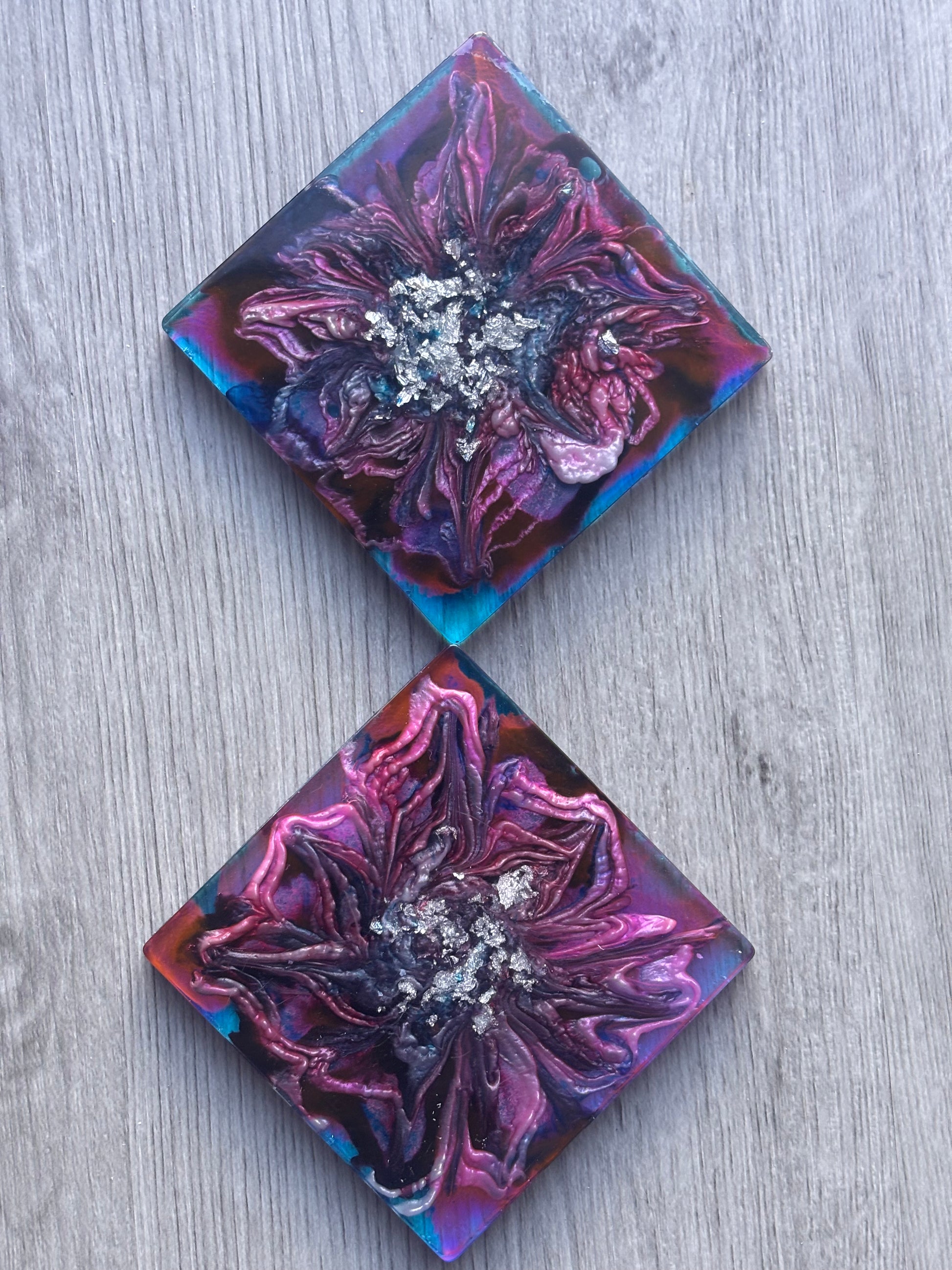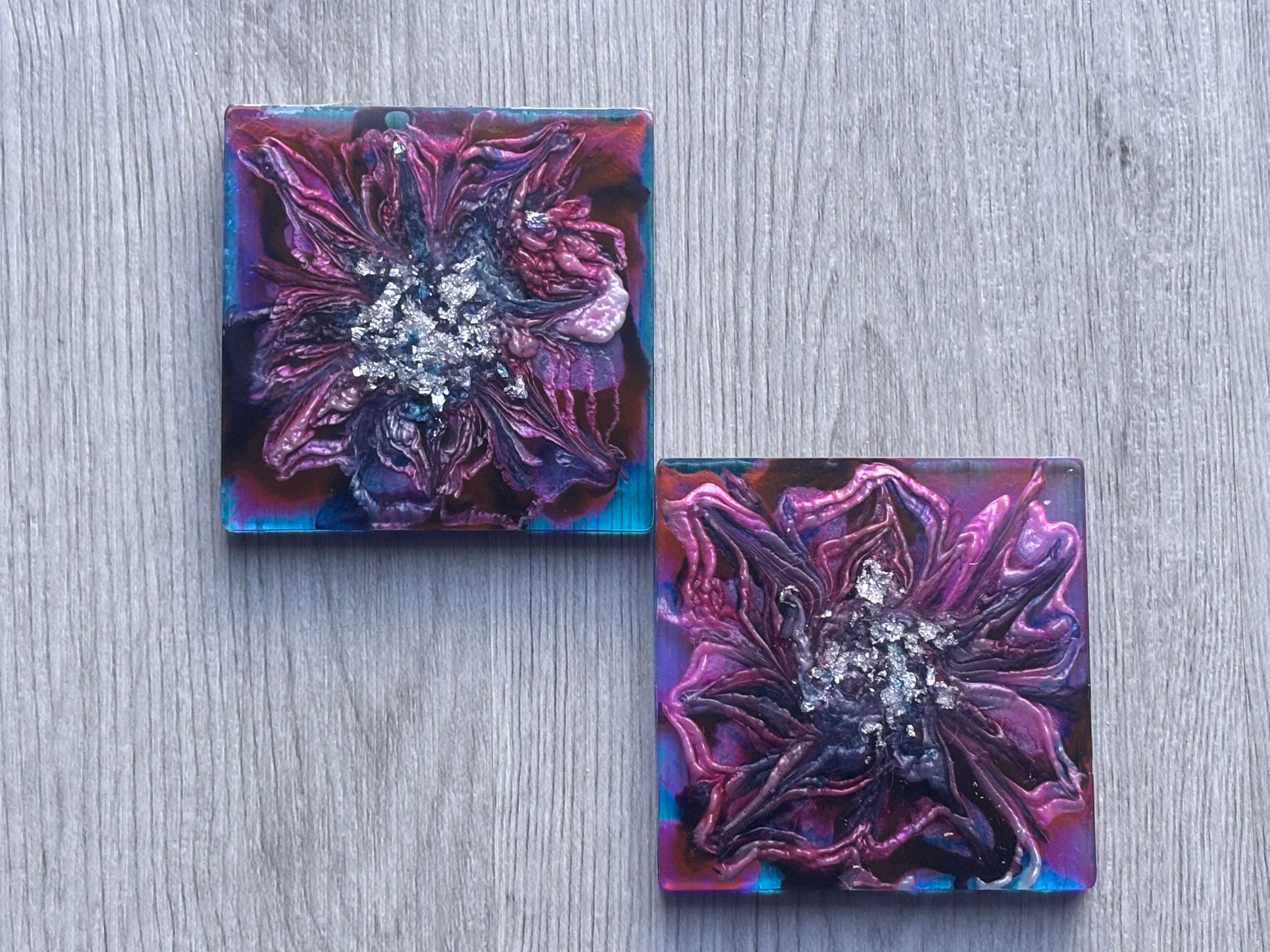 2 piece coaster set, swirled with red and blue with a touch of silver in the center. These moody, floral-inspired coasters are perfect for adding depth to your decor.